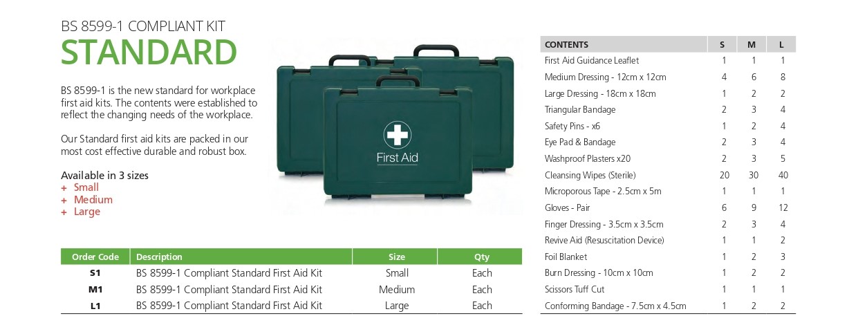 The Standard range is pragmatically designed and offered in three key sizes: Small (S1), Medium (M1), and Large (L1). This size differentiation is critical as it allows employers to perfectly tailor their first aid provision based on the specific risk profile (Low or High Risk) and the maximum number of employees on site at any given time, as mandated by the Health and Safety (First-Aid) Regulations 1981.