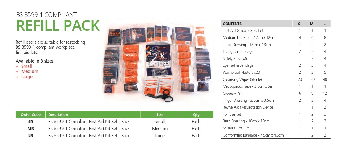 For instance, if your risk assessment dictates you need a Medium kit (suitable for low-risk environments with up to 50 people), you simply purchase the Medium (MR) First Aid Refill Pack. This size consistency eliminates confusion during the restocking process, ensuring the correct quantity of each component is replenished according to the BS 8599-1 table.